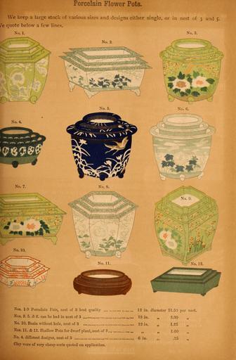 | Keywords: Descriptive catalogue of flowering, ornamental trees, shrubs, bulbs, herbs, climbers, fruit trees, &c., &c., &c (15320040491).jpg Porcelain Flower Pots <br> We keep a large stock of various sizc and desinrns either single or in nest of 3 and 5 <br> /e quote below a few lines <br> Nos 1-9 Porcelain Pot nest of 3 best qaality 12 m diameter 1 50 per nest <br> Nos 3 5 6 can be bad in nest of 3 IS in 5 00 <br> No 10 Basin without bole nest of 3 12 ia 1 23 <br> Nos 11 12 Shallow Pots for dwarf plant nest of 3 1 00 <br> No 4 different designs nest of 3 6 in 35 <br> Clay ware of very cbeap sorts quoted on application 45212304 161075 84671 Page 95 Text http //www biodiversitylibrary org/page/45212304 1909-10 Yokohama Ueki Kabushiki Kaisha Biodiversity Heritage Library Descriptive catalogue of flowering ornamental trees shrubs bulbs herbs climbers fruit trees c c c / Catalogs Japan Yokohama-shi Mertz Library The New York Botanical Garden bhl page 45212304 dc identifier http //biodiversitylibrary org/page/45212304 Nursery Catalogs flowers plants bulbs Nurseries Horticulture Porcelain Flower Pots mertz library the new york botanical garden nursery catalogs porcelain flower pots Information field Flickr posted date ISOdate 2014-09-22 CC-BY-2 0 BioDivLibrary https //flickr com/photos/61021753 N02/15320040491 2015-08-25 22 51 17 cc-by-2 0 PD-old-70-1923 bulbs 1909 catalogs Descriptive catalogue of flowering ornamental trees shrubs bulbs herbs climbers fruit trees c c c Photos uploaded from Flickr by FĂŚ using a script Flowerpots |