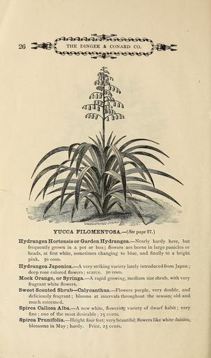 Keywords: Descriptive catalogue of new and beautiful roses (16249138468).jpg CR SSr L'P5 i' <br> JtST PH' ' <br> YUCCA VITjOWE-NTOSA See page 27 <br> Hydrangea Hortensis or Garden Hydrangea Nearly hardy here but <br> frequently grown in a pot or box ; flowers are borne in large panicles or <br> heads at first white sometimes changing to blue and finally to a bright <br> pink 50 cents <br> Hydrangea Japoniea A very striking variety lately introduced from Japan ; <br> deep rose colored flowers ; scarce 50 cents <br> Mock Orange or Syringa A rapid growing medium size shrub with very <br> fragrant white flowers <br> Sweet Scented Shrub Calycanthus Flowers purple very double and <br> deliciously fragrant ; blooms at intervals throughout the season; old and <br> much esteemed <br> Spirea Callosa Alba A new white flowerin-g variety of dwarf habit ; very <br> fine ; one of the most desirable ; 25 cents <br> Spirea Prunifolia Height four feet; very beautiful; flowers like white daisies;;; <br> blossoms in May ; hardy Price 25 cents 43902564 150007 78561 Page 26 Text http //www biodiversitylibrary org/page/43902564 1875 10 5962/bhl title 78561 Dingee Conard Co ; Henry G Gilbert Nursery and Seed Trade Catalog Collection NameFound Callosa NameFound Calycanthus NameConfirmed Calycanthus EOLID 61998 NameBankID 2645103 NameFound Hortensis NameConfirmed Hortensis NameBankID 4618629 NameFound Hydrangea NameConfirmed Hydrangea sect Cornidia Ruiz Pav Engl EOLID 40082 NameFound Prunifolia NameFound Syringa NameConfirmed Syringa EOLID 38055 NameBankID 2655523 NameFound Yucca NameConfirmed Yucca L EOLID 33611 Biodiversity Heritage Library Descriptive catalogue of new and beautiful rosesnew album Garden Stories Catalogs Flowers Roses Seeds Trade catalogs U S Department of Agriculture National Agricultural Library bhl page 43902564 dc identifier http //biodiversitylibrary org/page/43902564 bhlGardenStories Yucca filomentosa Dingee Conard Co BHLinbloom u s department of agriculture national agricultural library bhlgardenstories dingee conard co bhlinbloom Information field Flickr posted date ISOdate 2015-02-03 CC-BY-2 0 BioDivLibrary https //flickr com/photos/61021753 N02/16249138468 2015-08-24 05 53 49 cc-by-2 0 PD-old-70-1923 Descriptive catalogue of new and beautiful roses Photos uploaded from Flickr by FĂŚ using a script |