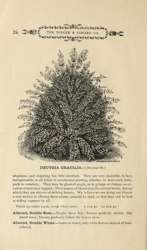 | Keywords: Descriptive catalogue of new and beautiful roses (16249135048).jpg  DEUTZIA G-RAC11 IS  See page 25 <br> situations and requiring but little attention They are very desirable in fact <br> indispensable in all kinds of ornamental planting whether in door-yard lawn <br> park or cemetery They may be planted singly or in groups or clumps as oc- <br> casion or taste may suggest Their season of bloom lasts for several weeks during <br> which they are objects of striking beauty We believe we are doing our friends <br> a real service in offering these plants prepaid by mail so that they can be had <br> at trifling expense by all <br> Price 25 cents each except where noted 5 FOR 1 12 FOR 2 <br> Almond Double Rose  Height three feet ; flowers perfectly double like <br> small roses ; blooms profusely before the leaves show <br> Almond Double White  Same as above only white flowers instead of rose- <br> colored 43902562 150007 78561 Page 24 Text http //www biodiversitylibrary org/page/43902562 1875 10 5962/bhl title 78561 Dingee Conard Co ; Henry G Gilbert Nursery and Seed Trade Catalog Collection NameFound Deutzia NameConfirmed Deutzia EOLID 11171771 NameBankID 2649641 Biodiversity Heritage Library Descriptive catalogue of new and beautiful rosesnew album Garden Stories Catalogs Flowers Roses Seeds Trade catalogs U S Department of Agriculture National Agricultural Library bhl page 43902562 dc identifier http //biodiversitylibrary org/page/43902562 bhlgardenstories deutzia gracilis Dingee Conard Co taxonomy binomial Deutzia gracilis BHLinbloom u s department of agriculture national agricultural library dingee conard co taxonomy binomial deutzia gracilis bhlinbloom Information field Flickr posted date ISOdate 2015-02-03 CC-BY-2 0 BioDivLibrary https //flickr com/photos/61021753 N02/16249135048 2015-08-24 05 54 58 cc-by-2 0 PD-old-70-1923 Descriptive catalogue of new and beautiful roses Photos uploaded from Flickr by FĂŚ using a script |