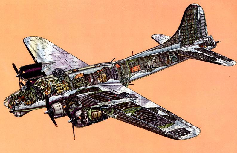 Keywords: Its long range, bomb carrying capacity, and ability to absorb punishment makes the B-17 a devastating weapon. The outstanding records attained by the Boeing Flying Fortress in sustaining terrific beatings over enemy territory is attributed to the plane's all-metal, semi-monocoque structure, covered with a smooth aluminum alloy stressed skin, a feature which proves that damage to part of the plane does not necessarily cause failure of the entire structure. Framework of the B-17 fuselage is made up of bulkheads and circumferential stiffeners, tied together by longerons and longitudinal stiffeners. Over this framework and permanently fastened to it with aluminum alloy rivets, is an aluminum alloy, 24ST clad skin. Thickness of this skin varies from .025 gauge to.051 gauge, depending upon the load it is required to carry. The fuselage is divided into several compartments to house the crew, the bombs, armament and special equipment. These compartments include: the bombardier-navigator compartment in the nose of the plane; the cockpit which is back and above the nose compartments; the lower compartment, under the cockpit floor, which is reached through trapdoors; the bomb bay occupying the space between the bulkheads to which the front and rear wing spar connections are made; the radio compartment immediately behind the bomb bay; the waist gun compartment which extends aft to the tail turret; and the tail turret itself which is assembled as a separate unit of the fuselage. The nose compartment, besides the metal section consists of a molded transparent plastic shell, and a flat plate glass bomb sight panel which provides wide vision for both the bombardier and the navigator. This Plexiglas nose section is bolted to the fuselage. Entrance into the nose compartment is provided by a door in the bulkhead which divides the nose compartment from the rest of the fuselage. The pilot's cockpit and the top gun turret are located in an elevated compartment in the forepart of the fuselage. This compartment contains the pilot, co-pilot and top gunner positions, all flight controls and instruments, some radio remote control equipment and a portion of the oxygen supply. Entrance is made from either the door in the bulkhead which divides it form the bomb bay, or from the lower accessory compartment through a folding hatch in the floor between the pilots' stations. The front section of the fuselage structure has three rail section extruded 24ST longerons, one at the bottom and two near the top to carry the primary load and to reinforce the pilot's compartment which is a cutout in the top of the basic monocoque structure. All three of these rail sections taper from the wing joining area, toward the front, reducing the "I" sections to "T" sections. Supports of the cockpit floor are large, built-up beams which slope aft and are anchored to the bulkhead below the cockpit. Actual floors of the cockpit, as all other floors in the airplane, are not structural members, but are built of weight-saving plywood. Windows of the pilot's compartment are flat glass panels. The windshield or front panels of ¼" thick transparent plastic are fixed and leakproof, while the side panels of the sliding type are shatterproof 3/16"-thick Plexiglas. The lower accessory compartment under the pilots' cockpit contains much of the accessory equipment of the airplane, the vertical flight gyro and aileron servo unit, oxygen bottles, control cables and brackets, emergency bomb door release "dog-leg" mechanism, the generator voltage regulators and the external battery receptacle. This compartment also provides the means for personnel transition between the nose compartment and the remainder of the airplane. Exit form the airplane may be made at the forward end of the compartment through a hatch equipped with releasable hinge pins which permit quick and complete removal of the door in an emergency. The bomb bay immediately aft of the pilots' compartment is the most highly reinforced part of the entire fuselage structure, since through the bulkheads which separate it form the front and rear sections of the fuselage, the wing loads are transferred. Reinforcement is also provided to support the bomb loads and body bending loads. Bulkheads at each end of the bomb bay carry the upper and lower wing spar chord loads across the fuselage section. This crosswise strength is carried by four square steel tubes, two in each bulkhead, heat-treated to 180,000 psi. Steel tubes are connected trusswise by square tubing members of 24ST. These crosswise trusses have connected to them the anchor point of the wing terminals. Another structural member, the lower rail section that runs through the front section of the fuselage, splices into the lower chord of the bomb bay beam on top of which is a catwalk. This truss which lies along the center line of the airplane between the doors in the bulkheads consists of upper and lower chords and diagonals, built up of square 24ST tubing, on top of which is the catwalk, constructed of extruded "T's" and a web, furnishing support for the center bomb racks as well as providing body bending continuity through the bomb bay. Outboard bomb rails are supported at the bottom by compression trusses on each side of the fuselage, and are attached to circumferential stiffeners at the top. The bottom surface of the bomb bay between the spar bulkheads and between the side body compression trusses is composed of two doors. Doors are hinged at the sides and open simultaneously for bombing operations and for use as an emergency exit. Equipment installed permanently in the bomb bay includes the bomb rails, which reinforce the compression and bomb trusses, the fuel transfer pump, two bomb rack selector switches and the bomb door retracting mechanism. Just aft of the bomb bay is the radio compartment with facilities for three crew members. A door in the forward end of this compartment provides access into the bomb bay, and a door in th