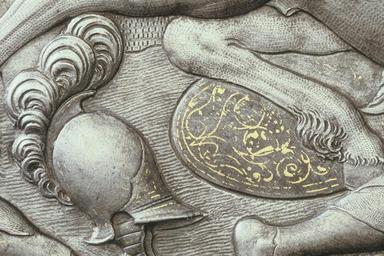 | Keywords: Detalj, hjälm - Livrustkammaren - 4696.tif Arboga faktori sv Rund sköld med bukig framsida Dekorerad i hög relief fylld med figurscener Pigg i mitten 13 cm lång Insidan klädd i röd sammet Två sammetshandtag sydda av tre cm breda band svarta metallspännen nya 36 nitar med sexkantiga brickor håller fodret på plats runt hela kanten Den inre ringen nitar har åtta dylika <br/>Rustningen som består av 18 delar enligt nuvarande numrering levererades till Erik XIV 1562 Materialet är stål med etsad och driven dekor samt pålagt guld Tillverkad vid Arbogas vapenfaktori och dekorerad i Antverpen av guldsmeden Eliseus Lieberts efter förlagor från den franske konstnären Etienne Delaune Hela garnityret är dekorerat med mytologiska gestalter fjättrade fångar stridsscener och trofégrupper samt Vasavapnet tre Kronors-vapnet och Folkungalejonet <br/>Rustningen kan tex ha använts vid något av de många festtåg som kungen arrangerade både av krigisk och fredlig art Ett av dessa ägde rum efter fälttåget mot Danmark 1564 då Erik red in i Stockholm i stor triumf Han medförde både troféer och krigsfångar som utgjorde en levande illustration till rustningsgarnityrets dekor <br/>Häststjärnan levererades ett år senare 1563 och har en annan dekor den sändes som ett varuprov på dekor och Erik beställde ytterligare minst en rustning från Antwerpen original caption Detalj hjälm 1562 steel g 4143 size mm 580 LRK Erik XIV av Sverige Sweden - A Royal Treasury 1988-1989 Tre Konungar på Åbo slott 1993 Örnen och de tre kronorna 2003 Parures Triomphales 2003 Sous l'égide de Mars Armures des Princes d'Europe' tid arbetstitel Armures et décors maniéristes francais 2011 Musée de l'Armée Maktspel - ett kostymdrama i Livrustkammaren 2014-2015 Livrustkammaren place of origin Antwerpen Arboga original filename lm_t05317 62757 inventory number LRK 26089 4696 CC-BY-SA <gallery caption Different images of same object > File Rustning tillhörande Erik XIV - Livrustkammaren - 22454 tif File Rustning - Livrustkammaren - 5330 tif File Krig med amazonerna på Erik XIVs sköld från 1562 - Livrustkammaren - 4600 tif File Rustning - Livrustkammaren - 82376 tif File Erik XIVs paradsköld gjord i stål 1562 Dekorerad med krigande Amazoner - Livrustkammaren - 96162 tif File Sadel till Erik XIV paradrustning från 1562 - Livrustkammaren - 13891 tif File Erik XIVs rustning från 1562 - Livrustkammaren - 73817 tif File Pressbilder till utställningen Maktspel - Livrustkammaren - 96582 tif File Erik XIV rustning och sköld från 1562 i manieristisk stil - Livrustkammaren - 31016 tif </gallery> Eliseus Libaerts Étienne Delaune Round shields Media contributed by LSH unmatched creator Media contributed by LSH 2014-11 |