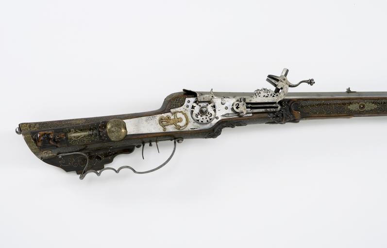 Keywords: Detalj hjullåsstudsare - Livrustkammaren - 5416.jpg Vänskapen Amicitia personifikation plain text Åttsidig räfflad pipa 6 räfflor och skålade bommar rektangulärt svansskruvblad <br/>Riktmedel Inlaxade riktmedel ståndsikte av stål med v-formig skärm stolpkorn av mässing <br/>Fästning Tre häften Pipan fäst med krysskruv underifrån främre varbygelskruven samt ett och ett halvt urspr tre pipstift av ben <br/><br/>Hjullås med plant låsbleck av tysk typ utvändigt hjul täckt av en plan genombruten hjulkapsel med två sjöjungfrur På låsblecket bakom hjulkapseln en pålagd figur av mässing i form av en man med slunga Fängpanna med bakåtböjd krutskärm fängpannelock med rörlig arm fingergrepp med kulformig avslutning Tryckknapp med litet skivformigt huvud Hane med fyrsidig kropp med genombruten skärm akantusrankor och lejon Lös överkäke och käkskruv med fyrsidigt huvud fingergreppet s-formigt svängt avslutat med en profilerad knapp Hanfjäder med lång spolformigt löv Hanstudel i form av en genombruten platta Hela låset bär spår av kraftigt nött gravyr Fängpannelockets drivfjäder blånerad <br/>Fästning Två låsskruvar <br/>Avtryckare med snälltryck <br/><br/>Helstock av valnöt med kolv av tysk typ På hela stocken punkt- och tråddekor av mässing Bakplåt av mässing med graverat plåtband och försänkt medaljong med genombruten dekor i form av en grip stödkula av stål På kolvvingen en snidad volut som övergår i lejonfigur på vingens undersida ett trärör På anslaget tre genombrutna bleck med växtornamentik Mellan låsskruvarna en oval av mässing med genombruten dekor förställande en kvinnofigur Amicitia Vänskapen ovanför ovalen en öppen krona på sidorna en ängel och ett lejon Kolvlådelock med framtill en oval plåt av mässing med graverad dekor i form av blomma och akantusblad Därbakom snidade flikar med punktdekor en kvinnofigur omgiven av trådornament en snidad knästående naken mansfigur med korg på axeln Locket avslutas baktill med ett vågkantat mässingsband med bladdekor Låsskruvbrickor bladformiga omgivna av bladslingor med odjurshuvuden De två bakre pipstiftbrickorna i form av en rund mässingsring med blad Under kammaren en snidad maskaron liksom på framstockens bakre del Liten överrrörka och ett genombrutet näsband Varbygel med tre fingerlägen på bygeln mittås och punsad dekor <br/><br/>Tillbehör <br/>Laddstock av trä l 840 mm med skoning av horn l 25 mm original caption detalj hjullåsstudsare - LRK 3202<br/> Nyckelord Hjullåsstudsare Föremålsbild early other date century 17 brass e78 - eldvapen - stockbeslag och stockdekor material mässing - steel e1247 - eldvapen - pipa lås riktmedel och beslag material stål - brass e6 - eldvapen - låsdekor material mässing - walnut e3 - eldvapen - stock material valnöt size mm 1065 size mm 782 pipa size mm 166 g 3590 LRK place of origin original filename lm_dig2119 39779 inventory number LRK 3202 5416 CC-BY-SA Göran Schmidt <gallery caption Different images of same object > File Detalj kolvlådelock hjullåsstudsare - Livrustkammaren - 22540 jpg File Detalj stockdekor hjullåsstudsare v sida - Livrustkammaren - 31102 jpg File Detalj hjullåsstudsare v sida - Livrustkammaren - 13977 jpg File Detalj kolvllådelock hjullåsstudsare - Livrustkammaren - 48220 jpg File Detalj kolvkappa hjullåsstudsare - Livrustkammaren - 39662 jpg File Hjullåsstudsare - Livrustkammaren - 42888 tif </gallery> Göran Schmidt Musket images from Livrustkammaren color images Wheellock musket images from Livrustkammaren Media contributed by LSH dim-with multiple size templates Media contributed by LSH unmatched keyword Color images from Livrustkammaren Media contributed by LSH 2013-10