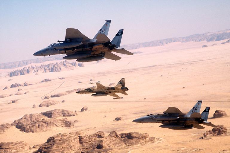 Keywords: DF-ST-92-07776 (5375303821).jpg An air-to-air view of two U S Air Force F-15C Eagle fighter aircraft from the 33rd Tactical Fighter Wing Eglin Air Force Base Fla and a Royal Saudi Air Force F-5E Tiger II fighter aircraft during a mission in support of Operation Desert Storm The aircraft are armed with AIM-9 Sidewinder air-to-air missiles https //www flickr com/photos/usairforce/5375303821/ DF-ST-92-07776 2011-01-21 11 23 https //www flickr com/people/39513508 N06 US Air Force from USA PD-USGov Official U S Air Force https //flickr com/photos/39513508 N06/5375303821 2016-12-15 01 13 51 United States Government Work Files from the U S Air Force Flickr stream Files uploaded by Reguyla United States Air Force |