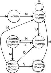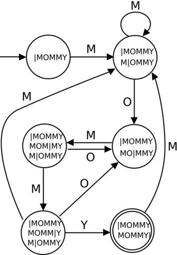 | Keywords: DFA search mommy.svg DFA demonstrating a finite automaton based search for the word mommy Whenever the final state double-circled is reached a match has been found All transitions that are not specified return to the initial state in the upper left To see why it needs to be so complicated just trace its behavior for the string MMOMOMMOMMY 2006-05-27 own assumed Dcoetzee Deterministic finite state automata | ||||