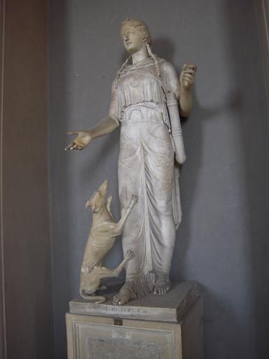 Keywords: Diana, Vatican.JPG Artwork Roman The history of the statue is interesting Although her body appears to be female it is a fifth century BC Greek statue of the god Apollo with the head of a second century Roman Diana She is identified as the goddess of the moon because of the lunar crescent on her forehead and of the hunt as shown by the Greyhound and the quiver at her side which were carved and attached in the late 18th century by a local sculptor marble Roman Museum musei Vaticani Galleria del Candelabri PD-old-100 Photo Henry Townsend Galleria dei Candelabri Vatican Diana Sculptures of women Statues of Diana Females with weapons in art Greyhounds in art in antiquity Diana with greyhounds Sculptures of greyhounds Ancient Roman statues in the Vatican Museums Diana Statues of animals in Rome dogs |