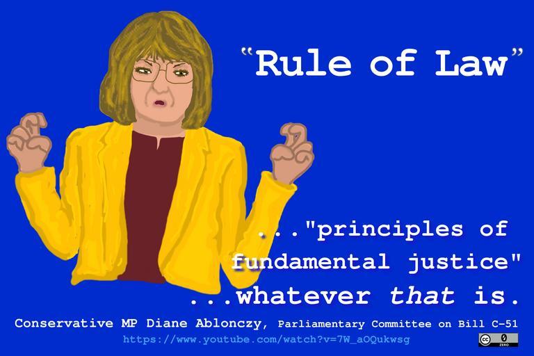 Keywords: diane ablonczy dianeablonczy harper government harpergovernment member of parliament memberofparliament bill c-51 c51 stopbillc51 regectfear I was stunned to hear Conservative MP Diane Ablonczy actually say this to the Parliamentary Committee on Bill C-51. We elect people to send to Ottawa to make law, so it is quite distressing to hear one of the lawmakers express sentiments so ignorant and dismissive of the law of the land. It inspired me to create a mini-poster with a caricature of Ms. Ablonczy tracing air quotations marks around "Rule of Law and "principles of fundamental justice". Here's the full quote: "Now the judge has to also consider, in addition to the Charter, and the CSIS Act, they have to consider something like "Rule of Law" they have to consider things like "principles of fundamental justice...whatever that is." Conservative MP Diane Ablonczy And you can see the video here: www.youtube.com/watch?v=7W_aOQukwsg I've released this into the Public Domain via CC0. And you can see the video here: www.youtube.com/watch?v=7W_aOQukwsg I've released this into the Public Domain via CC0. I was stunned to hear Conservative MP Diane Ablonczy actually say this to the Parliamentary Committee on Bill C-51. We elect people to send to Ottawa to make law, so it is quite distressing to hear one of the lawmakers express sentiments so ignorant and dismissive of the law of the land. It inspired me to create a mini-poster with a caricature of Ms. Ablonczy tracing air quotations marks around "Rule of Law and "principles of fundamental justice". Here's the full quote: "Now the judge has to also consider, in addition to the Charter, and the CSIS Act, they have to consider something like "Rule of Law" they have to consider things like "principles of fundamental justice...whatever that is." Conservative MP Diane Ablonczy And you can see the video here: www.youtube.com/watch?v=7W_aOQukwsg I've released this into the Public Domain via CC0. And you can see the video here: www.youtube.com/watch?v=7W_aOQukwsg I've released this into the Public Domain via CC0. |