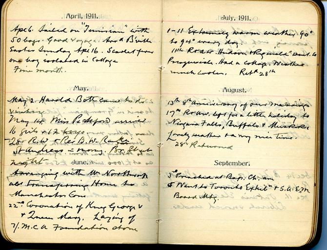 Keywords: 1880s 1890s 1900s 1910s 1920s diaries home children homechildren April 1911 April 6th, Sailed on "Tunisian" with 50 boys. Good voyage. Arrived Belleville Easter Sunday April 16th, Scarlet fever, one boy isolated in cottage five months May 1911 May 2nd, Harold Both came to do Visiting May 14th, Miss Pickford arrived 16 girls & 12 boys May 28th, RW & Rev B W Ranki, St Andrews in morning. Bridge Street at night. Arranging with Mr Northwork about transposing Home to Manchester Co 22nd, Coronation of King George V & Queen May. Laying of YMCA Foundation Stone July 1911 July 1 - 11 Extremely warm weather 90 degrees to 94 degrees every day 11th, R & AW, Hudson & Reginald went to Presquisle. Had a cottage. Weather much cooler. Returned 28th. August 1911 Aug. 13th, The 8th anniversary of our marriage 17th, R & A W left for a little holiday to Niagara Falls, Buffalo & Muskoka. Lovely weather & a very nice time, 28th returned. September 1911 Sept. 3rd, Preached at Bap. Church a.m. 5th Went to Toronto Exhibition & S.A.E. Board meeting April 1911 April 6th, Sailed on "Tunisian" with 50 boys. Good voyage. Arrived Belleville Easter Sunday April 16th, Scarlet fever, one boy isolated in cottage five months May 1911 May 2nd, Harold Both came to do Visiting May 14th, Miss Pickford arrived 16 girls & 12 boys May 28th, RW & Rev B W Ranki, St Andrews in morning. Bridge Street at night. Arranging with Mr Northwork about transposing Home to Manchester Co 22nd, Coronation of King George V & Queen May. Laying of YMCA Foundation Stone July 1911 July 1 - 11 Extremely warm weather 90 degrees to 94 degrees every day 11th, R & AW, Hudson & Reginald went to Presquisle. Had a cottage. Weather much cooler. Returned 28th. August 1911 Aug. 13th, The 8th anniversary of our marriage 17th, R & A W left for a little holiday to Niagara Falls, Buffalo & Muskoka. Lovely weather & a very nice time, 28th returned. September 1911 Sept. 3rd, Preached at Bap. Church a.m. 5th Went to Toronto Exhibition & S.A.E. Board meeting |