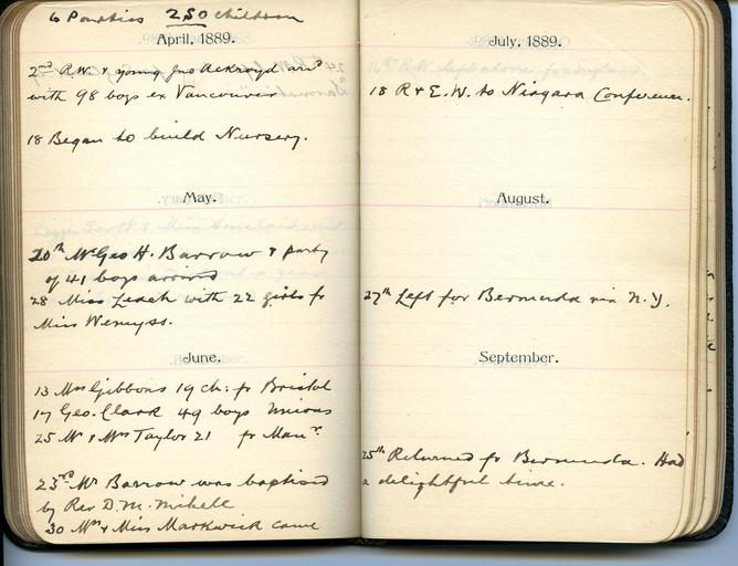 Keywords: 1880s 1890s 1900s 1910s 1920s diaries home children homechildren document text writing 6 Parties - 250 children April 1889 Apr. 2nd, RW and young John Ackroyd arrived with 98 boys ex Vancouver April 18 Began to build Nursery May 1889 20th, Mr Geo H Barrow and party of 41 boys arrived 28th, Miss Leach with 22 girls from Miss Wemyss June 1889 13th, Mrs Gibbons 19 children from Bristol 17th, Geo Clark 49 boys Unions [?] 25th, Mr & Mrs Taylor 21 from Manchester 23rd, Mr Barrow was baptized by Rev DM Mikell 30th, Mr and Miss Markwick came July 1889 18th, R & E W to Niagara Conference August 1889 27th, left for Bermuda via NY September 1889 25th Returned from Bermuda and had a delightful time 6 Parties - 250 children April 1889 Apr. 2nd, RW and young John Ackroyd arrived with 98 boys ex Vancouver April 18 Began to build Nursery May 1889 20th, Mr Geo H Barrow and party of 41 boys arrived 28th, Miss Leach with 22 girls from Miss Wemyss June 1889 13th, Mrs Gibbons 19 children from Bristol 17th, Geo Clark 49 boys Unions [?] 25th, Mr & Mrs Taylor 21 from Manchester 23rd, Mr Barrow was baptized by Rev DM Mikell 30th, Mr and Miss Markwick came July 1889 18th, R & E W to Niagara Conference August 1889 27th, left for Bermuda via NY September 1889 25th Returned from Bermuda and had a delightful time |