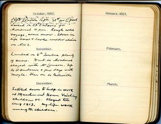 | Keywords: 1880s 1890s 1900s 1910s 1920s diaries home children homechildren document text writing indoor October 1882 Left London 12 pm, 25th for Liverpool. sailed on S. S. "Ontario" for Montreal 4 pm. Rough cold voyage, some snow. Stove in life boat and broke rudder chain on Nov 3. November 1882 Landed on 6th Quebec plenty of snow. Went to Montreal stayed with Mr. Louson. Up to St Andrews and few days with Moyle. Then on to Belleville. December 1882 Settled down to help in work at Marchmont Home visiting children &c. Stayed till August 1913. My life work among the children. October 1882 Left London 12 pm, 25th for Liverpool. sailed on S. S. "Ontario" for Montreal 4 pm. Rough cold voyage, some snow. Stove in life boat and broke rudder chain on Nov 3. November 1882 Landed on 6th Quebec plenty of snow. Went to Montreal stayed with Mr. Louson. Up to St Andrews and few days with Moyle. Then on to Belleville. December 1882 Settled down to help in work at Marchmont Home visiting children &c. Stayed till August 1913. My life work among the children. |