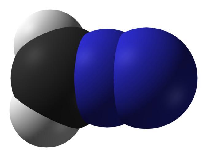 | Keywords: Diazomethane-from-CRC-MW-IR-3D-vdW.png Space-filling model of the diazomethane molecule H<sub>2</sub>CN<sub>2</sub> Structural information determined by microwave and infrared spectroscopy from http //www hbcpnetbase com/ CRC Handbook 88<sup>th</sup> edition Image generated in http //accelrys com/products/discovery-studio/visualization/discovery-studio-visualizer html Accelrys DS Visualizer Own 2009-05-25 Ben Mills Benjah-bmm27 Images by Ben Mills Space-filling models Diazomethane | ||||