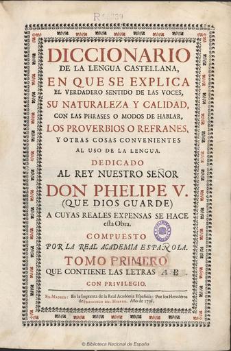 Keywords: Diccionario de la lengua castellana RAE 1726 1739.jpg es Diccionario de la lengua castellana en que se explica el verdadero sentido de las voces su naturaleza y calidad con las phrases o modos de hablar los proverbios o rephranes y otras cosas convenientes al uso de la lengua / Compuesto por la Real Academia Española Texto impreso - Madrid en la imprenta de Francisco del Hierro impressor de la Real Academia Española 1726-1739 - 6 v 8 LXXXXVI 723 p 1 h de lám ; 12 714 p ; 12 816 p ; 12 696 p 12 656 p ; 36 578 p ; Fol mlla Signatura R/23571 Portada a dos tintas enmarcadas con orlas tipográficas Es el denominado comúnmente Diccionario de Autoridades 1726 1739 http //bdh bne es/bnesearch/detalle/bdh0000053799 - Biblioteca Digital Hispánica Biblioteca Nacional de España Real Academia Española other versions BNE PD-old-100 Uploaded with UploadWizard Spanish language Books from Spain Title pages from Spain Real Academia Española Books published in Madrid Spain in the 18th century Spanish dictionaries |