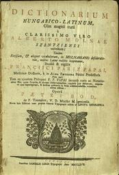Keywords: Dictionarium Hungarico-Latinum, Olim magnâ curâ à clarissimo viro.jpg hu Dictionarium Hungarico-Latinum Olim magnâ curâ à clarissimo viro Szenczi Molnár Albert 1574-1633 a magyar reformáció egyik legkiválóbb Ãrója prédikátor szótárkészÃtÅ‘ költÅ‘ fordÃtó Pápai Páriz Ferenc Dés 1649 május 10 “ Nagyenyed 1716 szeptember 10 tanár az orvoslás és a filozófia doktora és Bod Péter FelsÅ‘csernáton 1712 február 22 “ 1769 március 3 református lelkész irodalomtörténész közös műve http //www sk-szeged hu/statikus_html/kiallitas/bocskai/szenci html Szenczi Molnár Albert Pápai Páriz Ferenc Bod Péter Published Cibinii 1767 History of Hungary 1526 “1700 Books in Hungarian Books in Latin Dictionaries PD-old-100 |