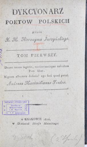 | Keywords: Dictionary of polish poets 1292.jpg   іхал Іє онім Юшинський Словник польских поетів К аків 1820 Титульний а куш З особистої бібліотеки І Ф анка M Yushynski Dictionary of polish poets Krakov 1820 From Ivan Franko personal Library Dykcjonarz poetów polskich t 1-2 powst 1798 wyd Kraków 1820 1820 Institution Shevchenko Institute of Literature Digital Collection PD-old-70-1923 Franko Personal Library Collections of books in libraries in Ukraine Shevchenko Institute of Literature Uploaded with VicuñaUploader Title pages in Polish |