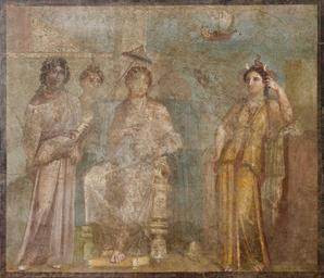 | Keywords: Dido throne MAN Napoli Inv8898.jpg Dido seated on a throne attended by handmaiden looking at the personnification of Africa wearing an elephant hide Aeneas' ship feature in the background Didon assise sur un trône entourée de ses suivantes regarde la personnification de l'Afrique coiffée d'une dépouille d'éléphant Les vaisseaux d'Énée apparaissent à l'horizon Didone regina di Cartagine seduta in trono è stata appena abbandonata da Enea che si allontana con la nave Ai suoi lati vi sono le personificazioni dell'Africa a sin e dell'Asia a des century 1 AD fresco cm 108 x 128 Institution Naples National Archaeological Museum Sala LXXII object history Provenance Pompeii Casa di Meleagro VI 9 2 atrium 2 credit line accession number Inv 8898 Marie-Lan Nguyen PD-old-100-1923 other versions Taken with Nikon D300s Taken with Sigma 17-50mm F2 8 EX DC OS HSM Ancient Roman frescos from Pompeii in the Museo Archeologico Naples 8898 Casa di Meleagro Pompeii Dido in ancient Roman paintings Aeneid Book 1 Africa personified in ancient Roman paintings |