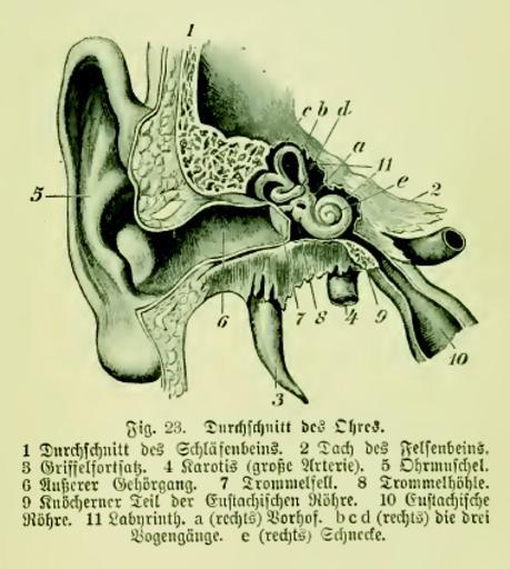 | Keywords: Die Frau als Hausärztin (1911) 023 Durchschnitt des Ohres.png  0 1 Durchschnitt des Schläfenbeins <br/> 0 2 Dach des Felsenbeins <br/> 0 3 Griffelfortsatz <br/> 0 4 Karotis große Arterie <br/> 0 5 Ohrmuschel <br/> 0 6 Äußerer Gehörgang <br/> 0 7 Trommelfell <br/> 0 8 Trommelhöhle <br/> 0 9 Knöcherner Teil der Eustachischen Röhre <br/> 10 Eustachische Röhre <br/> 11 Labyrinth <br/> a rechts Vorhof <br/> b c d rechts die drei Bogengänge <br/> e rechts Schnecke <br/> <br/> 1911 Die Frau als Hausärztin Mit 485 Original-Illustrationen 38 Tafeln und Kunstbeilagen in feinstem Farbendruck dem Porträt der Verfasserin und einem Modell-Album Mann und Weib 800 000 Jubiläumsausgabe Süddeutsches Verlagsinstitut Stuttgart 1911 diefraualshaus00fiscuoft Creator Anna Fischer-Dückelmann Custom license marker 2014 01 03 PD-US PD-old Illustrations from Die Frau als Hausärztin Uploaded with UploadWizard Anatomical plates and drawings of the human ears Diagrams of the human ears All portions of the human ear |