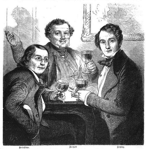 Keywords: Die Gartenlaube (1853) b 158.jpg Herloßsohn Berthold Lortzing 158 Three men Men looking at viewer Black and white drawings of people People drinking from glasses 1853 in Germany Albert Lortzing Male writers from Germany