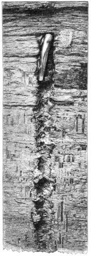 Keywords: Die Gartenlaube (1890) b 160 2.jpg Fig 6 Ende des Schußkanals eines kleinkalibrigen Nickelmantelgeschosses in trockenem Buchenholz 160 161 Bullet impacts
