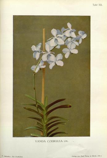 | Keywords: Die Orchideen (Tafel XII) (8580169426).jpg  Tafe XII <br> 11 CTlv --x <br> <br> t - <br> -iH-V -v <br> VANDA COERULEA LDL <br> - £ ec£ti n Die Orchideen <br> V riag von Pauf Parey in Berdn 5 W IL 32404549 100868 46623 Tafel XII Text http //www biodiversitylibrary org/page/32404549 1915 10 5962/bhl title 46623 Schlechter Rudolf Biodiversity Heritage Library Die Orchideen ihre Beschreibung Kultur und Züchtung Handbuch für Orchideenliebhaber Züchter und Botaniker Orchidaceae Orchidaceae culture Missouri Botanical Garden Peter H Raven Library bhl page 32404549 dc identifier http //biodiversitylibrary org/page/32404549 missouri botanical garden peter h raven library Information field Flickr posted date ISOdate 2013-03-22 CC-BY-2 0 BioDivLibrary https //flickr com/photos/61021753 N02/8580169426 2015-08-30 03 53 22 cc-by-2 0 PD-old-70-1923 Rudolf Schlechter - Die Orchideen - 1 Auflage 1915 Vanda coerulea Photos uploaded from Flickr by Fæ using a script |
