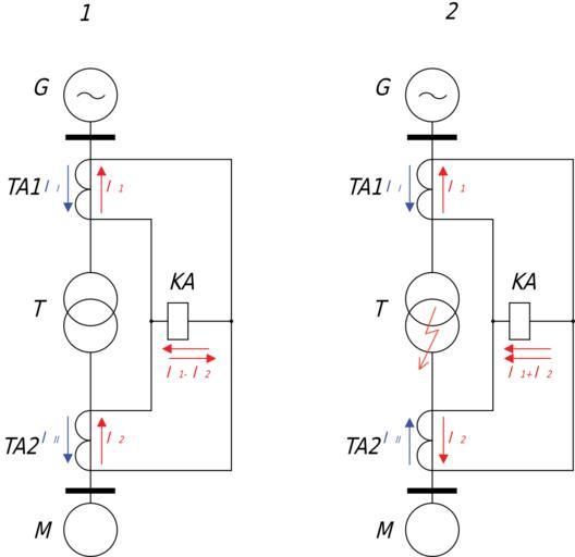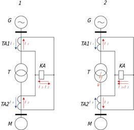 Keywords: Diff protection.svg Схема п одольной диффе енциальной защиты G - гене ато - двигатель T - силовой т ансфо мато TA1 TA2 - изме ительные т ансфо мато ы тока KA - обмотка еле тока 1 - но мальный ежим 2 - ко откое замыкание на защищаемом т ансфо мато е T Own 2008-03-04 FearChild One-line diagrams