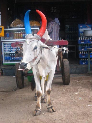 Keywords: Different coloured horns.jpg Bullock in front of a cart with one horn painted red the other blue By the roadside in front of a shop that sells soft drinks near Coimbatore in Tamil Nadu India Okse med eit raudmalt og eit blåmalt horn spent fast til ei vogn ved vegen Han står framfor ein butikk som sel vatn og brus nær Coimbatore i Tamil Nadu i India Own 2007-08-10 05 07 43 Ranveig Cattle in Tamil Nadu Carts in Tamil Nadu Decorated cattle in India Blue with red Ox-drawn carts in India |