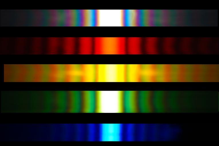| Keywords: Diffraction sunlight 0.02mm.jpg en Diffraction of sunlight through a 0 02 mm 20 micron slit; top trace unfiltered other traces filtered by bandpass filter Wratten filters no 29 15 13 and 47A ; a composite of five images made on the camera CCD without a lens Own Pieter Kuiper 2009-08-22 Diffraction |