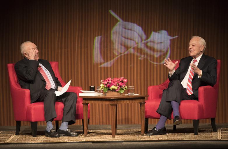 Keywords: lbj library lbjlibrary austin texas tx usa Former Face the Nation television anchor and veteran journalist Bob Schieffer discussed his storied career with Joseph Califano, Jr., domestic policy advisor to President Johnson, on Thursday evening, Jan. 21, 2016, at the LBJ Presidential Library auditorium. Schieffer retired in May 2015, in his 58th year as a reporter and his 46th year at CBS News. He is one of the few broadcast or print journalists to have covered all four major beats in the nation's capital – the White House, the Pentagon, the State Department and Capitol Hill. He won eight Emmys and numerous other journalism awards. Califano is founder and chairman of the board of The National Center on Addiction and Substance Abuse (CASA) at Columbia University and serves as a trustee of the LBJ Foundation. LBJ Library photo by Jay Godwin - January 21, 2016 Former Face the Nation television anchor and veteran journalist Bob Schieffer discussed his storied career with Joseph Califano, Jr., domestic policy advisor to President Johnson, on Thursday evening, Jan. 21, 2016, at the LBJ Presidential Library auditorium. Schieffer retired in May 2015, in his 58th year as a reporter and his 46th year at CBS News. He is one of the few broadcast or print journalists to have covered all four major beats in the nation's capital – the White House, the Pentagon, the State Department and Capitol Hill. He won eight Emmys and numerous other journalism awards. Califano is founder and chairman of the board of The National Center on Addiction and Substance Abuse (CASA) at Columbia University and serves as a trustee of the LBJ Foundation. LBJ Library photo by Jay Godwin - January 21, 2016