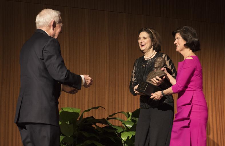 | Keywords: lbj library lbjlibrary austin texas tx usa Lynda Johnson Robb and Luci Baines Johnson present Bob Schieffer a bust of President Johnson. Former Face the Nation television anchor and veteran journalist Bob Schieffer discussed his storied career with Joseph Califano, Jr., domestic policy advisor to President Johnson, on Thursday evening, Jan. 21, 2016, at the LBJ Presidential Library auditorium. Schieffer retired in May 2015, in his 58th year as a reporter and his 46th year at CBS News. He is one of the few broadcast or print journalists to have covered all four major beats in the nation's capital – the White House, the Pentagon, the State Department and Capitol Hill. He won eight Emmys and numerous other journalism awards. Califano is founder and chairman of the board of The National Center on Addiction and Substance Abuse (CASA) at Columbia University and serves as a trustee of the LBJ Foundation. LBJ Library photo by Jay Godwin - January 21, 2016 Lynda Johnson Robb and Luci Baines Johnson present Bob Schieffer a bust of President Johnson. Former Face the Nation television anchor and veteran journalist Bob Schieffer discussed his storied career with Joseph Califano, Jr., domestic policy advisor to President Johnson, on Thursday evening, Jan. 21, 2016, at the LBJ Presidential Library auditorium. Schieffer retired in May 2015, in his 58th year as a reporter and his 46th year at CBS News. He is one of the few broadcast or print journalists to have covered all four major beats in the nation's capital – the White House, the Pentagon, the State Department and Capitol Hill. He won eight Emmys and numerous other journalism awards. Califano is founder and chairman of the board of The National Center on Addiction and Substance Abuse (CASA) at Columbia University and serves as a trustee of the LBJ Foundation. LBJ Library photo by Jay Godwin - January 21, 2016 |