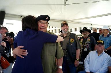 | Keywords: Vietnam veteran Ignacio Perez of Austin sheds tears as he hugs Luci Baines Johnson, daughter of President Lyndon Johnson and Lady Bird Johnson, at a Vietnam veterans recognition ceremony outside the LBJ Presidential Library on Wednesday, April 27, 2016. Each veteran at the ceremony received a Vietnam veteran lapel pin engraved on the back with “A Grateful Nation Thanks and Honors You.” The LBJ Library is hosting a three-day Vietnam War Summit from April 26-28. LBJ Library photo by Nick Ut 04/27/2016. Vietnam veteran Ignacio Perez of Austin sheds tears as he hugs Luci Baines Johnson, daughter of President Lyndon Johnson and Lady Bird Johnson, at a Vietnam veterans recognition ceremony outside the LBJ Presidential Library on Wednesday, April 27, 2016. Each veteran at the ceremony received a Vietnam veteran lapel pin engraved on the back with “A Grateful Nation Thanks and Honors You.” The LBJ Library is hosting a three-day Vietnam War Summit from April 26-28. LBJ Library photo by Nick Ut 04/27/2016. |