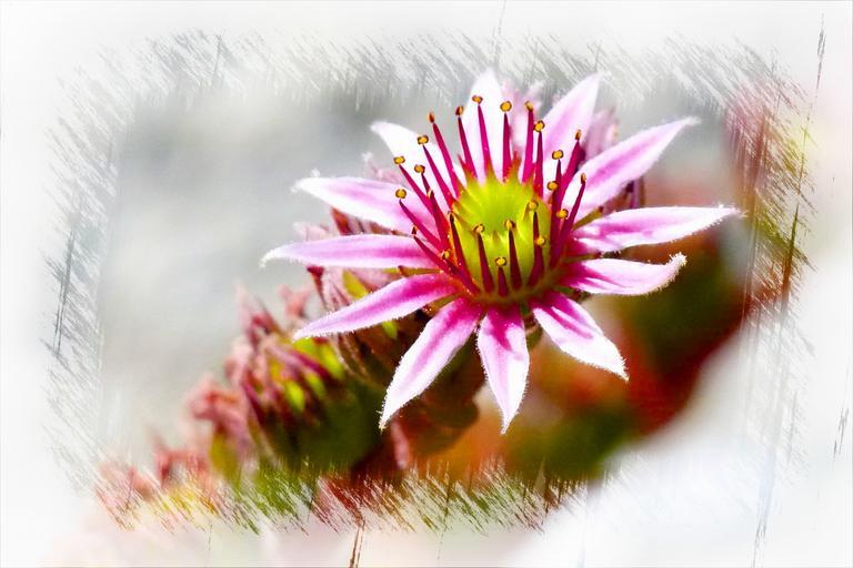 Keywords: digital art artwork graphical design computer graphic creative flower garden hens and chicks blossom close-up nature pink tiny
