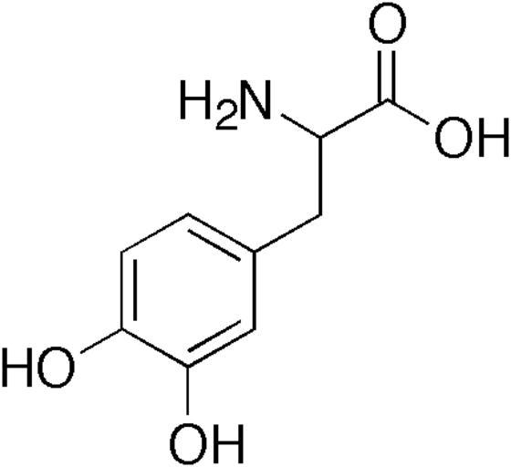 Keywords: Dihydroxyphenylalanine.png chemical structure of dihydroxyphenylalanine Own 16 35 23 October 2007 UTC Edgar181 Alpha-amino acids Catechols