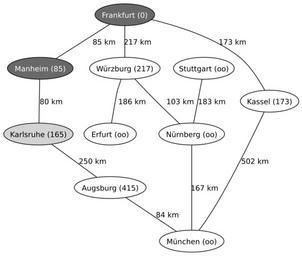 Keywords: DijkstraStep03.svg Third Step of a run of Dijkstra's algorithm on a map of Germany see Image MapGermanyGraph svg Created by de Benutzer Regnaron with graphviz Dijkstra's algorithm