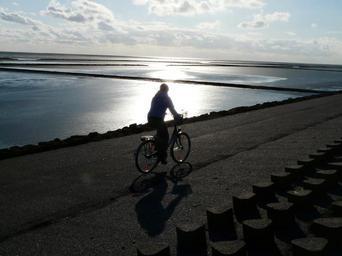 Keywords: dike dike road north sea nordfriesland cycling cycle dove back light sea ocean sparkle sun