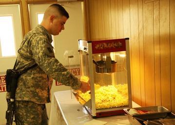 | Keywords: Diners at Ironhorse Oasis dining facility welcome new expansion DVIDS131860.jpg  en Sgt Joshua Painter a native of Marble Falls Texas who serves as the administrative non-commissioned officer for the deputy commanding general of 4th Infantry Division and Multi-National Division “ Baghdad serves himself some popcorn in the newly completed expansion of the Ironhorse Oasis Dining Facility at Camp Liberty Nov 26 2008-11-26 Sgt Whitney Houston https //www dvidshub net/image/131860 131860 2008-11-27 11 21 BAGHDAD IQ PD-USGov Camp Liberty Images from DoD uploaded by Fæ |