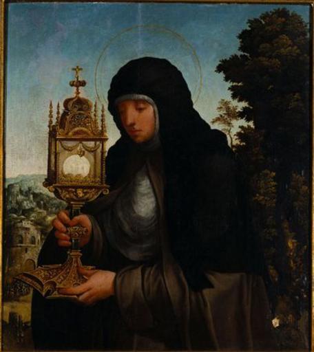 | Keywords: Diogo de Contreiras - Santa Clara.jpg  Artwork pt A pintura representa Santa Clara de Assis vestida com o hábito de franciscana e transportando nas mãos uma custódia com o SS Sacramento atributo iconográfico que lhe está associado e que tem a ver com um episódio da sua vida em que sendo o seu convento assediado pelos muçulmanos bastou a santa mostrar-lhe a custódia para os pôr em fuga A santa aparece retratado a três quartos ligeiramente voltada para a esquerda com o rosto voltado para a custódia que segura nas suas mãos Veste o hábito das franciscanas em preto cinzento e branco e apresenta a auréola que a identifica como santa A custódia dourada de grandes dimensões relativamente à santa e bastante elaborada ocupa na pintura um lugar tão importante quanto esta e está pintada com grande pormenor mostrando todo um rico trabalho de ourivesaria Ao fundo do lado direito um arvoredo pintado com bastante minúcia em vários tons de verde Do lado esquerdo o ataque dos muçulmanos ao convento de S Damião onde a santa vivia por detrás deste algumas casas e um céu pintado numa gradação de um azul esverdeado que parte do mais claro para o mais escuro de bastante luminosidade De realçar o profundo contraste entre as proporções bastante volumosas da santa e da custódia e a menor escala em que é pintado o fundo da pintura century 16 oil Institution Museu de Évora http //www matriznet imc-ip pt/ other versions PD-old-100 Diogo de Contreiras Paintings in the Museu de Évora Images from the Instituto dos Museus e da Conservação Paintings of Saint Clare of Assisi 16th-century oil paintings of standing women at half length 16th-century paintings of Christian saints Uploaded with UploadWizard |