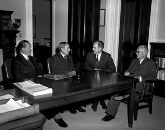 | Keywords: u.s. national archives usnationalarchives jfk presidential library jfkpresidentiallibrary blackandwhite monochrome indoor black and white Original Caption: Director of Food For Peace George McGovern Meets with Visitors We are looking for your help in identifying unknown people in our White House Photographs collection. If you have any information about this photograph, please post a comment, including any relevant sources, for the catalogers at the John F. Kennedy Presidential Library. Thank you! Local Identifier: JFKWHP-KN-17412 Created By: President (1961-1963 : Kennedy). Office of the Naval Aide to the President. (1961 - 1963) From: Robert Knudsen White House Photographs, 01/20/1961 - 12/19/1963 Contact: John F. Kennedy Library (LP-JFK), Columbia Point Boston, MA 02125-3398 Phone: 617-514-1600 Fax: 617-514-1652 Email: kennedy.library@nara.gov Production Dates: 4/3/1961 Scope and Content Note: In this photograph Director of Food for Peace Program George McGovern (second from right) and Ambassador of Peru Fernando Berckemeyer (far left) speak with two unidentified guests in the Food for Peace offices at the Executive Office Building, Washington, D.C. Persistent URL: JFK Library URL: www.jfklibrary.org/Asset-Viewer/Archives/JFKWHP-KN-17412.... Access Restrictions: Unrestricted Use Restrictions: Unrestricted Original Caption: Director of Food For Peace George McGovern Meets with Visitors We are looking for your help in identifying unknown people in our White House Photographs collection. If you have any information about this photograph, please post a comment, including any relevant sources, for the catalogers at the John F. Kennedy Presidential Library. Thank you! Local Identifier: JFKWHP-KN-17412 Created By: President (1961-1963 : Kennedy). Office of the Naval Aide to the President. (1961 - 1963) From: Robert Knudsen White House Photographs, 01/20/1961 - 12/19/1963 Contact: John F. Kennedy Library (LP-JFK), Columbia Point Boston, MA 02125-3398 Phone: 617-514-1600 Fax: 617-514-1652 Email: kennedy.library@nara.gov Production Dates: 4/3/1961 Scope and Content Note: In this photograph Director of Food for Peace Program George McGovern (second from right) and Ambassador of Peru Fernando Berckemeyer (far left) speak with two unidentified guests in the Food for Peace offices at the Executive Office Building, Washington, D.C. Persistent URL: JFK Library URL: www.jfklibrary.org/Asset-Viewer/Archives/JFKWHP-KN-17412.... Access Restrictions: Unrestricted Use Restrictions: Unrestricted |