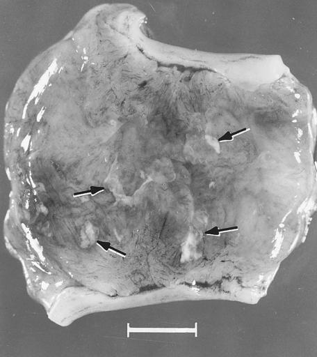 | Keywords: Diseases of Swine 17-5.png en 17 5 Segment of uterus opened to show necrotic remnants of a partially resorbed PPV-infected embryo arrows and associated extraembryonic membranes of a gilt experimentally infected oronasally immediately after breeding and killed 22 days later; remnants are laden with virus and viral antigen Bar 1 cm Mengeling et al 1980a Diseases of Swine 8th edition W L Mengeling W L Mengeling According to its copyright statement Copyright is not claimed for Chapters 17 23 25 31 and 64 which are in the public domain Diseases and disorders of pigs |