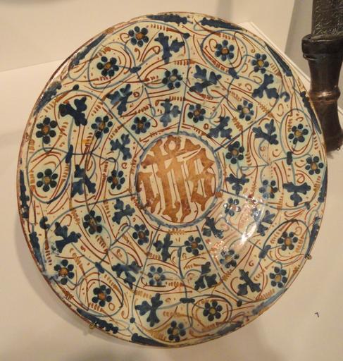Keywords: Dish with Christian Monogram, 1430-1470, Valencia (Manises), Spain, earthenware with cobalt and luster painting over glaze - Sackler Museum - DSC02539.JPG Exhibit in the Sackler Museum Harvard University Cambridge Massachusetts USA The museum permitted photography of this artwork without restriction This artwork is in the public domain because the artist died more than 70 years ago Daderot 2012-11-17 12 27 17 Daderot cc0 cc0 Pottery in the Sackler Museum Manises maiolica |