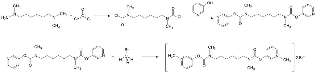 | Keywords: Distigmine bromide synthesis.svg  en Synthesis of Distigmine bromide US2789981 de Synthese von Distigmin Bromid US2789981 ausgehend von N N N' N'-Tetramethylhexamethylendiamin mit Phosgen 3-Hydroxypyridin und Methylbromid 2016-03-02 US2789981 Dork other versions v Distigmine Drug syntheses |