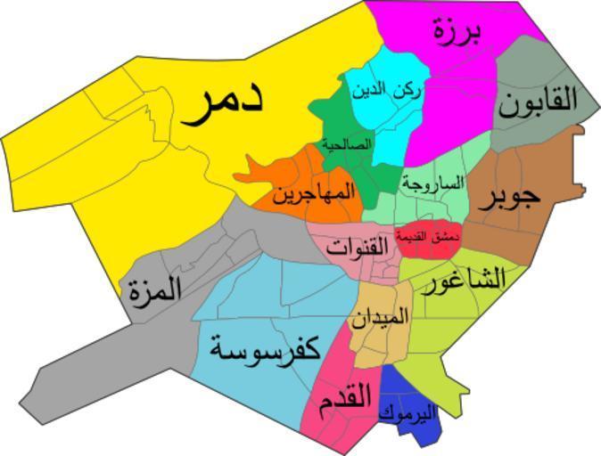 | Keywords: Districts of damascus arabic.png ar أحياء دمشق الستَّة عشر/مُحافظة دمشق، سوريا Districts of damascus arabic vector svg 50 2014-01-14 20 53 UTC Districts of damascus arabic vector svg --Goran tek-en <span class signature-talk >talk</span> 13 49 15 January 2014 UTC derivative work باسم Districts of damascus english svg <br/> Districts of damascus arabic vector svg Translated to Arabic - عُرِّبت باسم Districts_of_damascus gif Cc-zero Original upload log This image is a derivative work of the following images File Districts of damascus arabic vector svg licensed with CC share alike attribution <nowiki> en The 16 districts of the city/governorate of Damascus Syria own goran_tek-en other_ve</nowiki> Maps of Damascus Graphic Lab-ar |