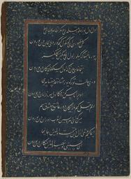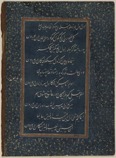 Keywords: Divan of Sultan Husayn Mirza WDL6802.png Artwork ru Хусейн Байка а Султан Хо асана 1438-1506 fr Ḥusayn Bāyqarā Sultan de Khorassan 1438-1506 en Ḥusayn Bāyqarā Sultan of Khorasan 1438-1506 zh 侯赛因·巴 拉̄ 呼罗珊苏丹 1438-1506 pt Ḥusayn Bāyqarā Sultão de Khorasan 1438-1506 ar حسين بيقرة سلطان خراسان 1438-1506 es Ḥusayn Bāyqarā Sultán de Khorasan 1438-1506 ru Диван султана Хусейна и зы fr Divan du sultan Husayn Mirza en Divan of Sultan Husayn Mirza zh 苏丹侯赛因·米尔扎的诗集 pt Divã do Sultão Husayn Mirza ar ديوان السلطان حسين ميرزا ru Данный лист соде жит десять поэтических ст ок из дивана сбо ника стихотво ений составленного на тю кском чагатайском языке последним п авителем из династии Тиму идов султаном Хусейном и зой 1438 1506 гг Выполненный письмом насталик в технике декупаж этот ф агмент относится к ныне аз озненной укописи каллиг афия кото ой возможно была выполнена султаном Али аль- ашхади п име но в 1490 г Султан Хусейн и за ибн ансу ибн Байка а был п авителем Хо асана со столицей в Ге ате на те ито ии сов еменного Афганистана с 1469 г до своей сме ти в 1506 г Го од был важным культу ным цент ом кото ый п ивлекал не только тю кских и пе сидских поэтов но и исто иков художников и каллиг афов Сам п авитель был авто ом поэтических п оизведений тво ившим под псевдонимом Хусайни и его стихи на тю кском чагатайском языке <em>газели</em> в азме е <em> амаль</em> составили сбо ник названный <em> Divan-i Husayni </em> Диван Хусайни а этом листе буквы не написаны че нилами а искусно вы езаны из синей бумаги и затем наклеены на подложку к емового цвета об амленную полями ук ашенными золотыми вк аплениями на синем фоне Техника декупаж известна под названием <em>qit'a</em> что в буквальном пе еводе означает вы езание а художников аботавших в этой технике называли <em>qati'an</em> езальщики Каллиг афия в технике декупаж получила ши окое асп ост анение в последней четве ти 15-го века как указано в т актате Кади Ахмада на эту тему написанном в 1015 г хидж ы 1606 г н э <br>А абская каллиг афия; Иллюмини ование укописей; Исламская каллиг афия; Исламские укописи; Ту ецкая поэзия fr Ce feuillet comporte dix lignes de poésie extraite d'un divan recueil de poèmes écrit en turc tchagataï par le dernier souverain timouride le sultan Husayn Mirza 1438 1506 Rédigé en écriture nasta'liq par un processus de découpage ce fragment fait partie d'un manuscrit aujourd'hui dispersé peut-être calligraphié par le sultan 'Ali al-Mashhadi vers 1490 Le sultan Husayn Mirza b Mansur b Bayqara souverain du Khorrasan vécut à Hérat capitale du pays aujourd'hui en Afghanistan de 1469 à sa mort en 1506 La ville était un centre culturel important attirant à la fois des poètes turcs et persans ainsi que des historiens des artistes et des calligraphes Le souverain lui-même écrivait de la poésie sous le nom de plume d'Husayni et ses poèmes en turc tchagataï <em>ghazals</em> en mètre <em>ramal</em> furent réunis dans un recueil appelé le <em>divan-i Husayni</em> Les lettres de ce feuillet ne sont pas écrites à l'encre mais ont été découpées très adroitement à partir d'un papier bleu et collées sur un fond de couleur crème dont les marges sont pourvues d'un cadre décoré d'un saupoudrage d'or sur fond bleu Cette technique de découpage est connue sous le nom de <em>qit'a</em> un terme signifiant littéralement <em>découpe</em> et les artistes spécialisés dans cette technique étaient appelés les <em>qati'an</em> coupeurs La calligraphie en découpage devint populaire vers le dernier quart du XV<sup>e</sup> siècle comme le montre clairement le traité de Qadi Ahmad de 1015 A H 1606 apr J -C sur le sujet <br>Calligraphie arabe; Enluminures; Calligraphie islamique; Manuscrits islamiques; Poésie turque en This folio includes ten lines of poetry from a divan compendium of poems written in Chagatay Turkish by the last Timurid ruler Sultan Husayn Mirza 1438 1506 Executed in nasta'liq script through a process of découpage the fragment belongs to a now dispersed manuscript possibly calligraphed by Sultan 'Ali al-Mashhadi around 1490 Sultan Husayn Mirza b Mansur b Bayqara was ruler of Khurasan based in its capital city of Herat present-day Afghanistan from 1469 to his death in 1506 The city was an important cultural center attracting both Turkish and Persian poets as well as historians artists and calligraphers The ruler himself composed poetry using the pen name Husayni and his Chagatay Turkish poems <em>ghazals</em> in <em>ramal </em>meter were compiled in a collection called the <em>Divan-i Husayni</em> This folio s letters are not written in ink but have been cut out very skillfully from a blue paper