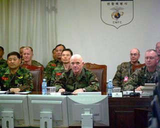 | Keywords: DM-SD-06-14055.jpeg en US Army USA General GEN Leon J LaPorte center Commander United Nations Command UNC Combined Forces Command CFC United States Forces Korea USFK UNC-CFC-USFK ; Republic of Korea ROK Marine Corps ROKMC Lieutenant General LGEN Kim In Sik left Commandant ROKMC; and US Marine Corps USMC Colonel Michael O ™Neal right Chief of Staff Marine Forces Pacific MARFORPAC ; listen to a briefing in the Video Teleconferencing Center VTC Room at Headquarters HQ UNC-CFC-USFK Combat Operations Center COC Yongsan Army Garrison Republic of Korea KOR during Reception Staging Onward Moving and Integration 2004 RSO I 04 a theater-level training exercise conducted annually by US military forces to test their ability to rapidly deploy various unit command and control functions to the Korean Peninsula 2000-01-01 01 52 58 https //research archives gov/id/6667570 Records of the Office of the Secretary of Defense other versions Custom license marker 2015 06 04 PD-USGov Uploaded with UploadWizard Leon J LaPorte Generals of the Republic of Korea Marine Corps Yongsan Garrison |