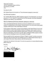 Keywords: DMCA counter-notice - Texas Instruments signing key controversy.tif Texas Instruments signing key controversy modified to remove personal details of issuer Based in part on text generated by the http //www chillingeffects org/dmca/counter512 pdf Chilling Effects DMCA Counter Notification Generator Full text follows Wikimedia Foundation<br/> 149 New Montgomery Street 3rd Floor<br/> San Francisco CA 94105<br/> USA November 20 2011 RE Mistaken Removal in the article on Texas Instruments signing key controversy Dear Wikimedia Foundation On 7 October 2009 following a DMCA takedown request by Texas Instruments you removed pursuant to 17 U S C Section 512 material from the following page concerning cryptographic signing keys provided by Texas Instruments https //en wikipedia org/wiki/Texas_Instruments_signing_key_controversy I have a good faith belief that this material was removed or disabled in error as a result of mistake or misidentification of the material I declare that this is true and accurate under penalty of perjury under the laws of the United States of America For the purposes of this matter I consent to the jurisdiction of the Federal District Court for the judicial district in which I reside Northern District of California I also consent to service of process by the person providing notification under Section 512 c 1 C or that person's agent However by this letter I do not waive any other rights including the ability to pursue an action for the removal or disabling of access to this material if wrongful Having complied with the requirements of Section 512 g 3 I remind you that you must now replace the removed material and cease disabling access to it within fourteen business days of your receipt of this notice Please notify me when this has been done I appreciate your attention to this matter If you have any questions or concerns about this notice please contact me Sincerely signature Derrick Coetzee phone number address redacted 2011-11-20 own Dcoetzee cc-zero Uploaded with UploadWizard Digital Millennium Copyright Act Chilling Effects |