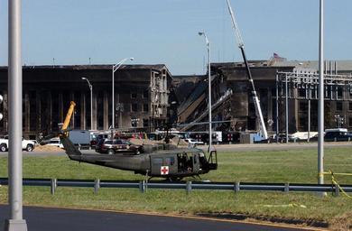 Keywords: DN-SD-03-17505.JPEG A United States UH-1H Iroquois Huey Army medical helicopter standing by in the event that injured survivors are found among the charred debris inside the Pentagon on September 12 2001 The morning before in an attempt to frighten the American people five members of Al-Qaida a terrorist group of fundamentalist Muslims hijacked American Airlines Flight 77 then flew a circuitous route returning to Washington and impacting the Pentagon killing all 64 passengers onboard and 125 people on the ground The impact destroyed or damaged four of the five rings in that section of the building Firefighters fought the fire through the night http //www dodmedia osd mil/Assets/Still/2003/Navy/DN-SD-03-17504 JPEG 2001-09-12 PH1 MICHAEL PENDERGRASS USN PD-USGov-Military-Navy The Pentagon on 12 September 2001 September 2001 photographs Bell UH-1 Iroquois Photographs by Michael W Pendergrass |