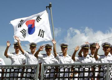 Keywords: DN-SD-07-12950.JPEG ID DN-SD-07-12950 Service Depicted 060921-N-0879R-010 Republic of Korea Navy Sailors from the Chungmugong Yi Sun-sin Class KDX-2 Destroyer DAE JO YEONG DDG 977 and the Cheonji Class Fast Combat Support Ship DAE CHEONG AOE 58 wave as they arrive for a port visit at at U S Naval Station Pearl Harbor Hawaii on Sept 21 2006 While in Hawaii the Korean sailors plan to visit the National Memorial Cemetery of the Pacific and meet with members of the local Korean community U S Navy photo by Chief Mass Communication Specialist David Rush Released Location NAVAL STATION PEARL HARBOR HAWAII HI UNITED STATES OF AMERICA USA http //www dodmedia osd mil/Assets/Still/2007/Navy/DN-SD-07-12950 JPEG 2006-09-21 MCC DAVID RUSH USN PD-USGov-Military-Navy Sailors of the Republic of Korea Navy National Memorial Cemetery of the Pacific