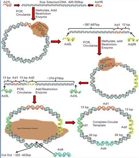 | Keywords: DNA Nanoball Adapter Ligation.png  en The Adapter sequences AD1L and AD1R are ligated to the size selected DNA The adapters complement each other and the DNA is circularized A restriction enzyme is added that cleaves the DNA AD2L and AD2R are ligated the DNA is circularized and a restriction enzyme cleaves the DNA AD3L and AD3R are added the DNA is circularized and a type III restriction enzyme is added This cleaves out a 300 - 400bp piece of DNA and AD4 replaces it to complete the circular adapter ligated template DNA own Suspencewl Cc-zero DNA helix-structures Biotechnology |