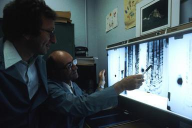 | Keywords: DNA sequencing.jpg  Two male scientists wearing lab coats in a laboratory looking at a highlighted light board reading the genetic code in the DNA Topics/Categories People -- Adult People -- Health Professional Science and Technology -- Genetics Type Color Photo Source National Cancer Institute Linda Bartlett Photographer 2018 1980 Reuse Restrictions None - This image is in the public domain and can be freely reused Please credit the source and/or author listed above Linda Bartlett Photographer PD-USGov-HHS-NIH Media from National Cancer Institute Visuals Online Images uploaded by Fæ |