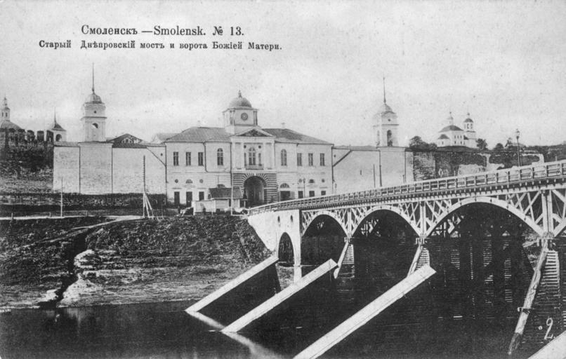 | Keywords: Dnieper gate in Smolensk 3.jpg en The bridge across the Dnieper River now destroyed the ruins and the Church of Our Lady of Smolensk now - the parochial school Dnieper gate ru ост че ез Днеп ныне аз ушен сох анились уины и це ковь Смоленской Богомате и ныне - це ковно-п иходская школа Днеп овские во ота О игинальная отк ытка е установлены before 1917 года PD-RusEmpire 20th-century postcards of Russia Postcards of Smolensk Dnieper River in Smolensk | ||||