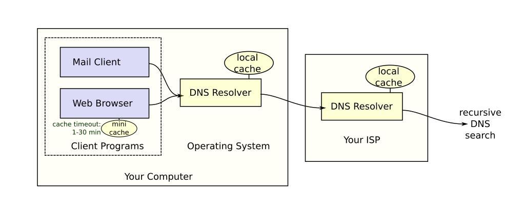 | Keywords: DNS in the real world.svg Mail client web browser with miniature DNS cache Client programs connect with a DNS resolver incorporated into the operating system of your computer The DNS resolver in your operating system is connected to your ISP's DNS resolver which also has a cache If something isn't found it's looked up via recursive DNS search Created by Lion Kimbro from reading of the text of Domain Name System DNS in the Real World own Lion Kimbro File DNS in the real world hu svg Hungarian translation - DNS flow diagrams |