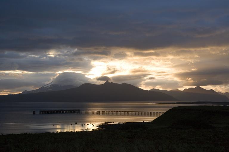 Keywords: dock sunset hills dusk evening solitary sky water shore clouds nature peaceful quiet