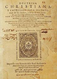 Keywords: Doctrina Christiana.jpg en Title page of the Doctrina christiana y catecismo para instruccion de los Indios the first book printed in South America in Lima 1585 by Antonio Ricardo 2011-06-21 http //www library upenn edu/exhibits/rbm/kislak/religion/lima1 html Anonymous printed by Antonio Ricardo PD-old-100 Uploaded with UploadWizard Title pages Early printed books Antonio Ricardo 1585 books Books from Peru Quechuan languages Aymara |
